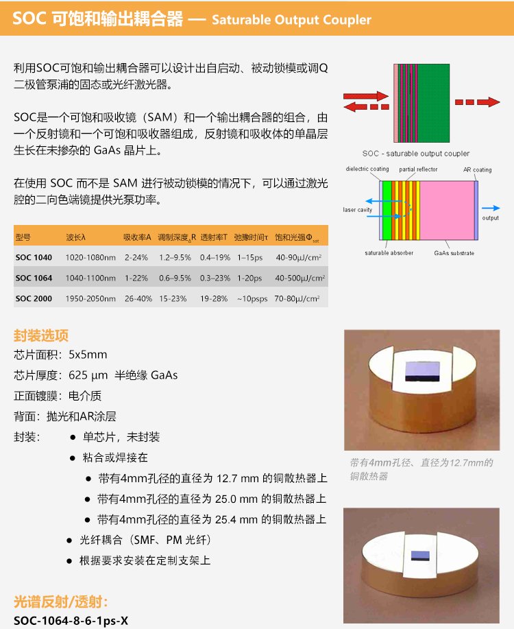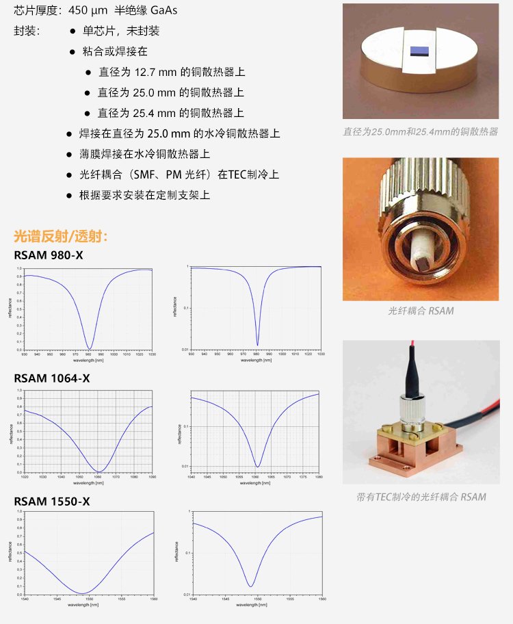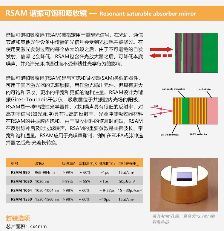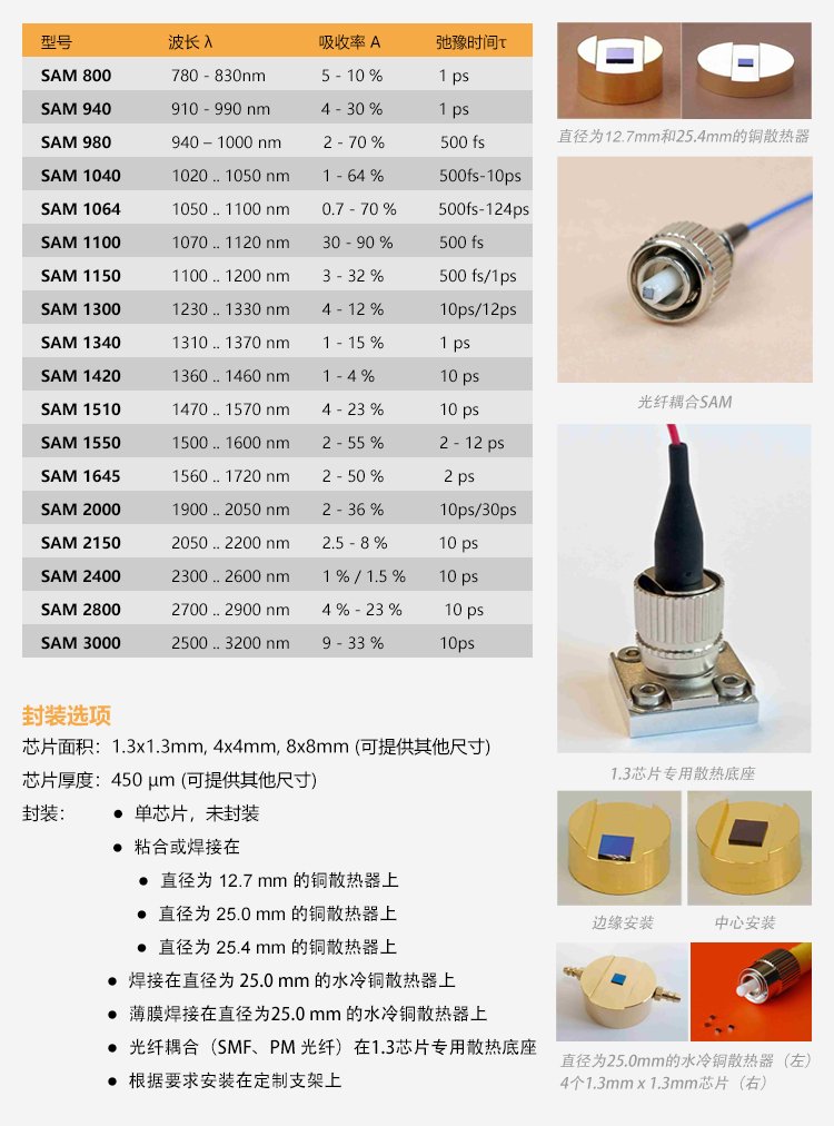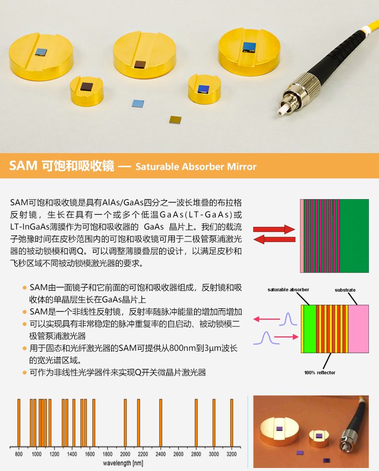SAM可飽和吸收體因?yàn)椴捎冒雽?dǎo)體材料和工藝,因此也叫半導(dǎo)體可飽和吸收鏡,適用的激光波長范圍達(dá)800nm到3.0μm,弛豫時(shí)間從500fs至25ps ,具有多種封裝方式。其鏡片的尺寸從1×1mm至4×4mm,厚度一般為400~450μm??娠柡衔甄R有多種封裝方式,例如裸片,鍍膜銅基底封裝,和光纖尾端,水冷式封裝等方式。