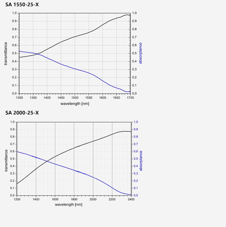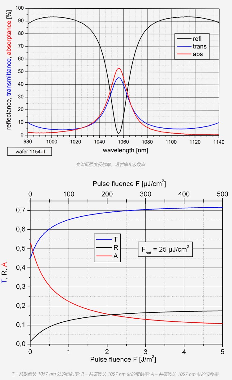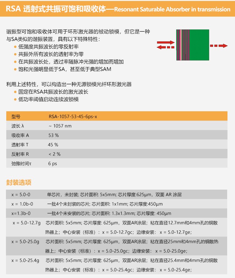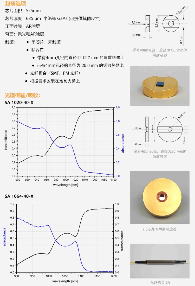 SAM可飽和吸收體因?yàn)椴捎冒雽?dǎo)體材料和工藝,因此也叫半導(dǎo)體可飽和吸收鏡,適用的激光波長范圍達(dá)800nm到3.0μm,弛豫時(shí)間從500fs至25ps ,具有多種封裝方式。其鏡片的尺寸從1×1mm至4×4mm,厚度一般為400~450μm??娠柡衔甄R有多種封裝方式,例如裸片,鍍膜銅基底封裝,和光纖尾端,水冷式封裝等方式。