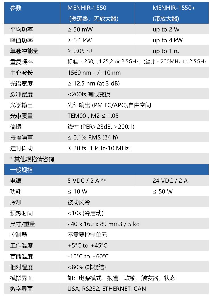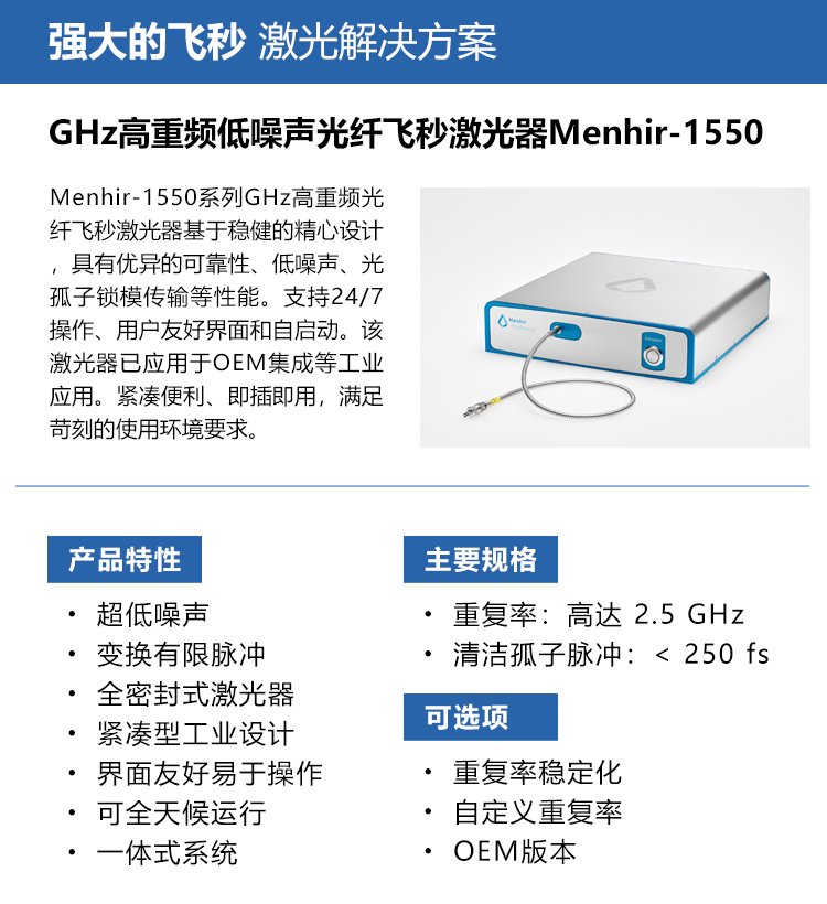 Menhir Photonics 提供具有當(dāng)今市場上最低相位噪聲和極高可靠性的鎖模激光器,MENHIR-1550系列有激光器是第一款頻率為1550nm,具有GHz重復(fù)率和超低噪聲性能的工作級飛秒激光器。