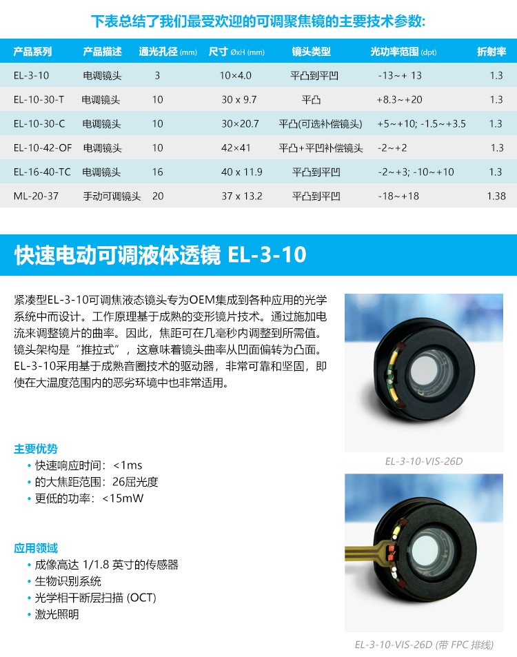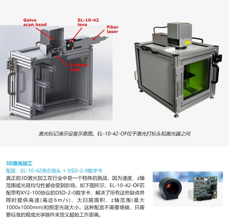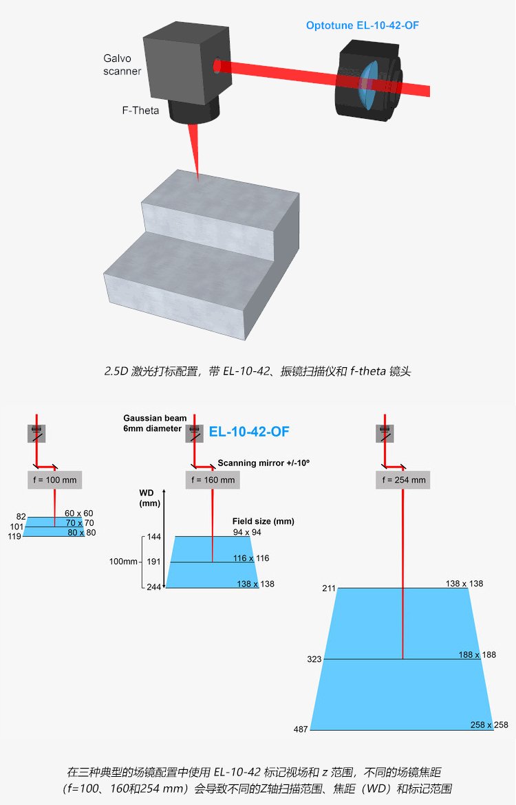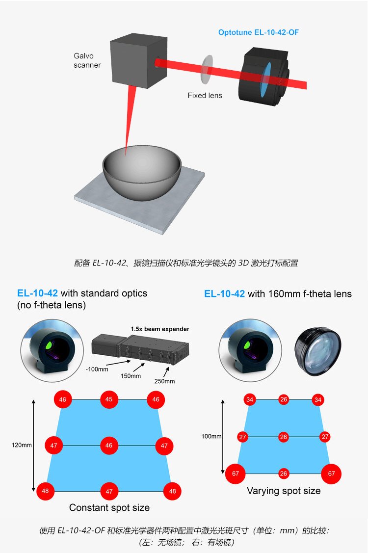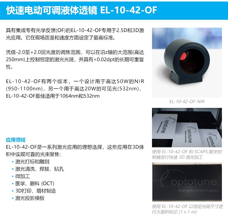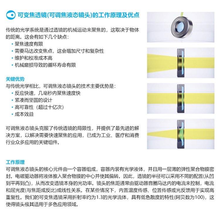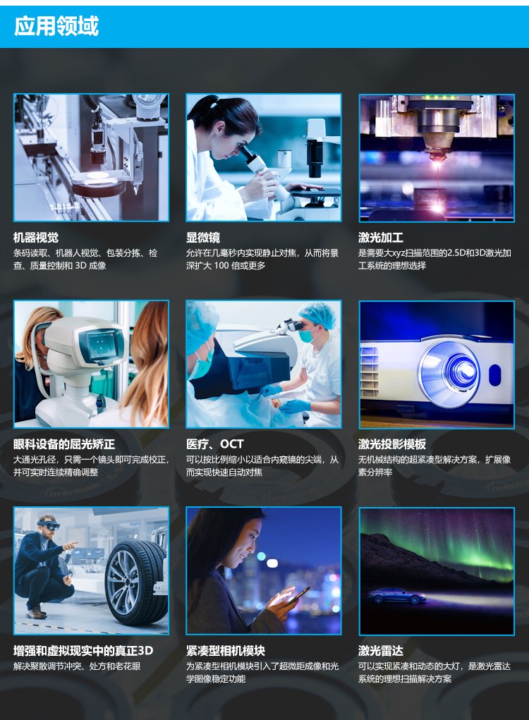 可調(diào)焦液態(tài)鏡頭采用液態(tài)聚合物基片,具有連續(xù)變焦功能。原理是基于光反饋通過電流改變聚焦鏡形狀(曲率),從而改變其焦距,支持2.5D和3D激光處理功能,是激光處理系統(tǒng)實現(xiàn)快速Z軸調(diào)光控制的最佳之選,典型應(yīng)用是3D激光掃描加工/打標。