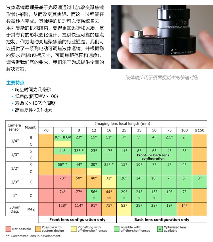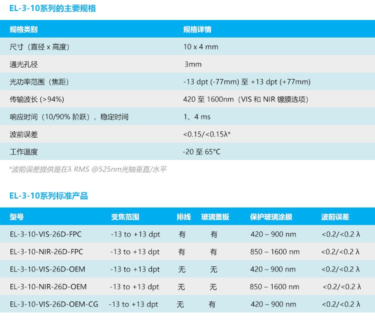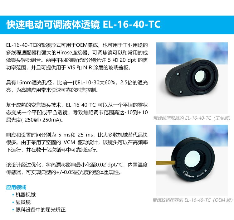 調(diào)焦液態(tài)鏡頭采用液態(tài)聚合物基片,具有連續(xù)變焦功能。原理是基于光反饋通過電流改變聚焦鏡形狀(曲率),從而改變其焦距,支持2.5D和3D激光處理功能,是激光處理系統(tǒng)實現(xiàn)快速Z軸調(diào)光控制的最佳之選,典型應(yīng)用是3D激光掃描加工/打標。我們一站式供應(yīng)各種類型的可調(diào)焦液態(tài)鏡頭,可變焦液態(tài)鏡頭,電動可調(diào)焦液態(tài)鏡頭,手動可調(diào)焦液態(tài)鏡頭,可變焦透鏡,,可提供選型、技術(shù)指導(dǎo)、安裝培訓(xùn)、個性定制等全生命周期、全流程服務(wù),歡迎聯(lián)系我們的產(chǎn)品經(jīng)理!